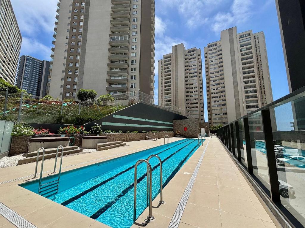 Hay una piscina al aire libre de temporada disponible para los huéspedes en Hermoso y acogedor depto en Costa de Montemar.